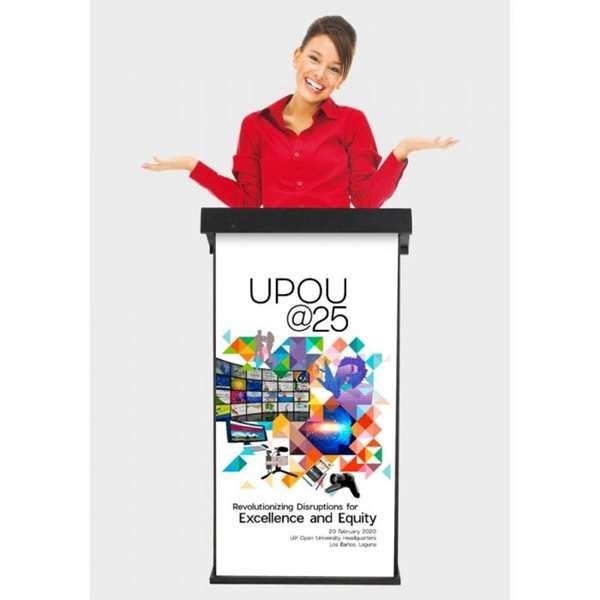 Es hat ein Aluminiumprofil zur Befestigung eines Banners, perfekt zur Präsentation des Firmenlogos oder einer Nachricht.